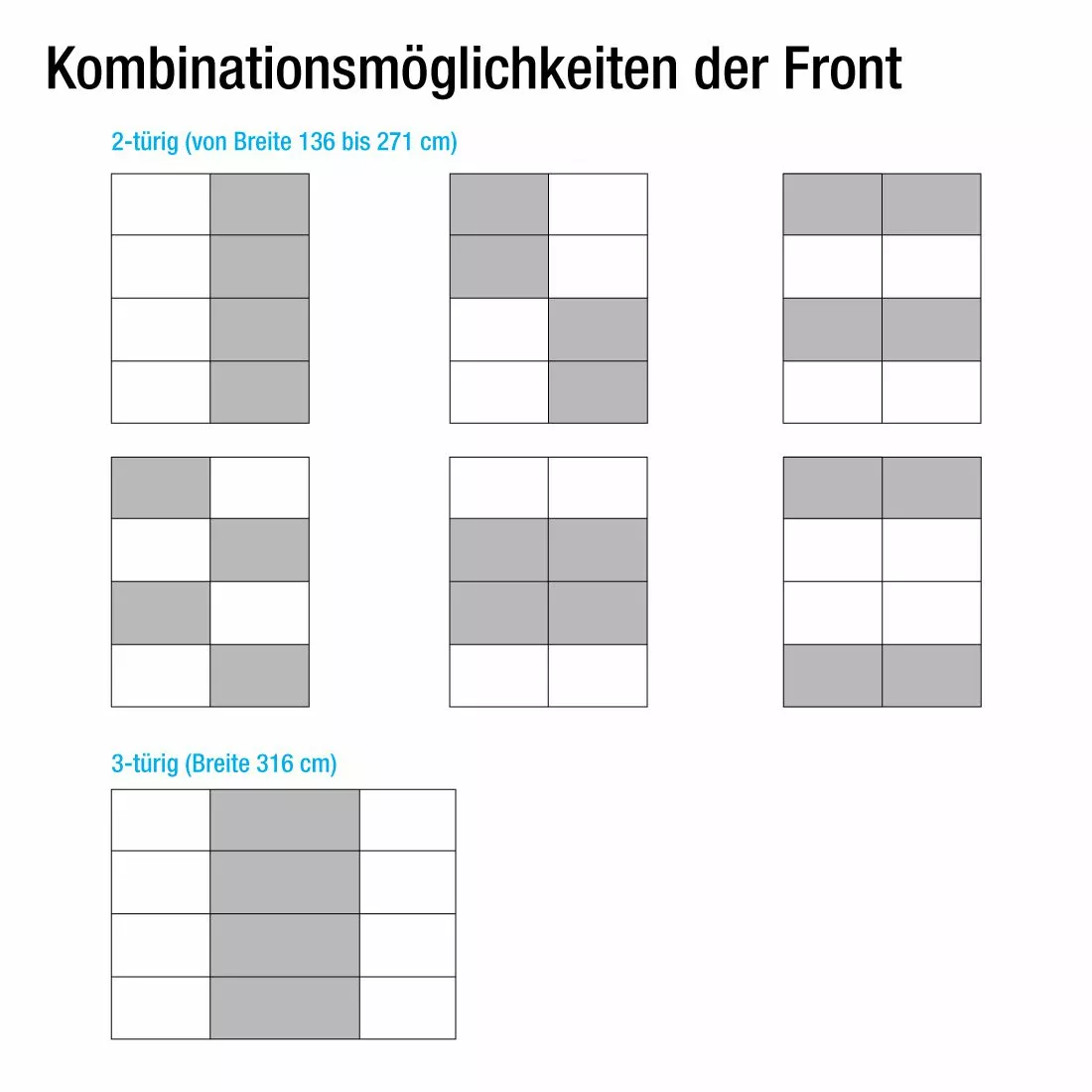 - Exception pour l’armoire de largeur : 315 cm avec 3 portes – Applications en miroir possibles seulement sur les portes centrales